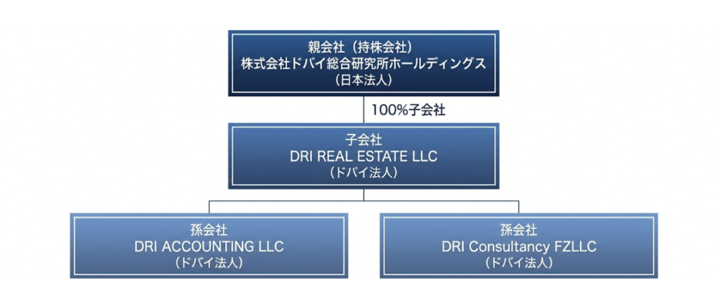 当グループは、日本を統括するホールディングスである「株式会社ドバイ総合研究所ホールディングス」のもと、各事業法人を配置する体制に移行いたしました。